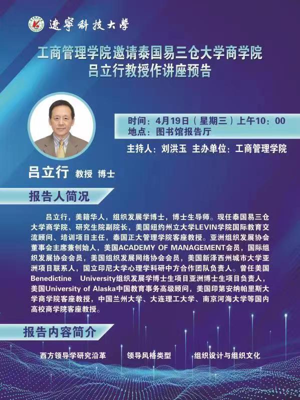 工商管理学院邀请泰国易三仓大学商学院吕立兴教授作讲座预告