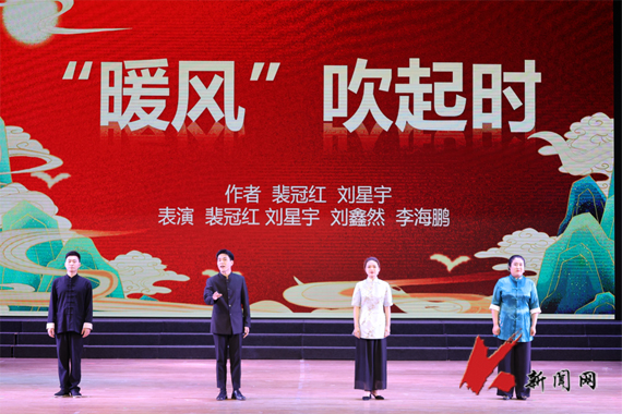 艺术学院教师裴冠红与表演2020级刘星宇共同创作,与刘鑫然、李海鹏四人表演的群口评书《“暖风”吹起时》,用评书特有的艺术形式生动再现了郭明义和辽科大辅导员曲文泉成功救助土木学院2009级患再生障碍性贫血的学生段懿的故事。张汉霄、代康康带来的经典快板作品《学雷锋》用接地气的语言讲述雷锋的成长经历和感人事迹。霍圣杰、白鹏渝的相声《这事我得管》在捧逗之间用诙谐的话语演绎了“学雷锋”路上遇到的窘事。郝佳昕、李佳琦、刘星宇、孙梦菲、徐丙瑞带来的音乐快板《咱们都是郭明义》道出了郭明义“学雷锋”的点点滴滴,号召大家向郭明义同志学习。演出以李俊杰、周壮的原创相声《一条朋友圈》压轴,两位老师用幽默风趣的语言讲述了电脑包失而复得的过程。